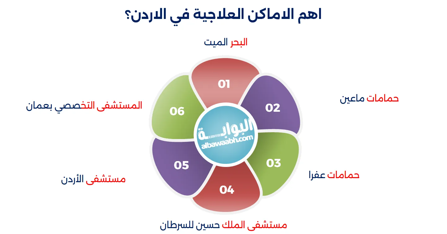 على سبيل المثال. البحر الميت. المشهور بخصائصه العلاجية الفريدة. بالإضافة إلى الينابيع المعدنية الغنية. والجو اللطيف الذي يساهم في تسريع عملية الشفاء. هذه العناصر تتضافر لتبدل رحلة العلاج إلى تجربة شاملة، تجمع بين الاهتمام بالصحة الجسدية وتعزيز الرفاهية النفسية.