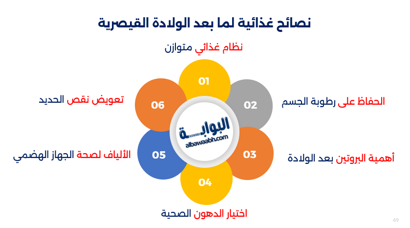 - اتباع النظام الغذائي الملائم ، والابتعاد عن الأنظمة الغذائية التي تسعى إلى خسارة كميات كبيرة من الوزن في فترات صغيرة، لأن هذه الأنظمة تتنافين مع متطلبات الجسم في التعافي ومتطلبات طفلك في هذه الفترة، لذلك يوصي باتباع نظام غذائي ملائم يوضع بوساطة مختص التغذية، لمنع التعرض لأي مشكلات بمرور الوقت.